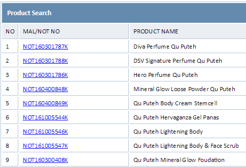 - Anda boleh lakukan carian untuk produk kosmetik dan juga produk selain kosmetik (seperti supplemen kesihatan dan ubatan tradisional)