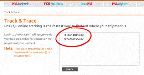 – Asingkan setiap nombor tracking dengan semicolon (;) atau butang <enter>