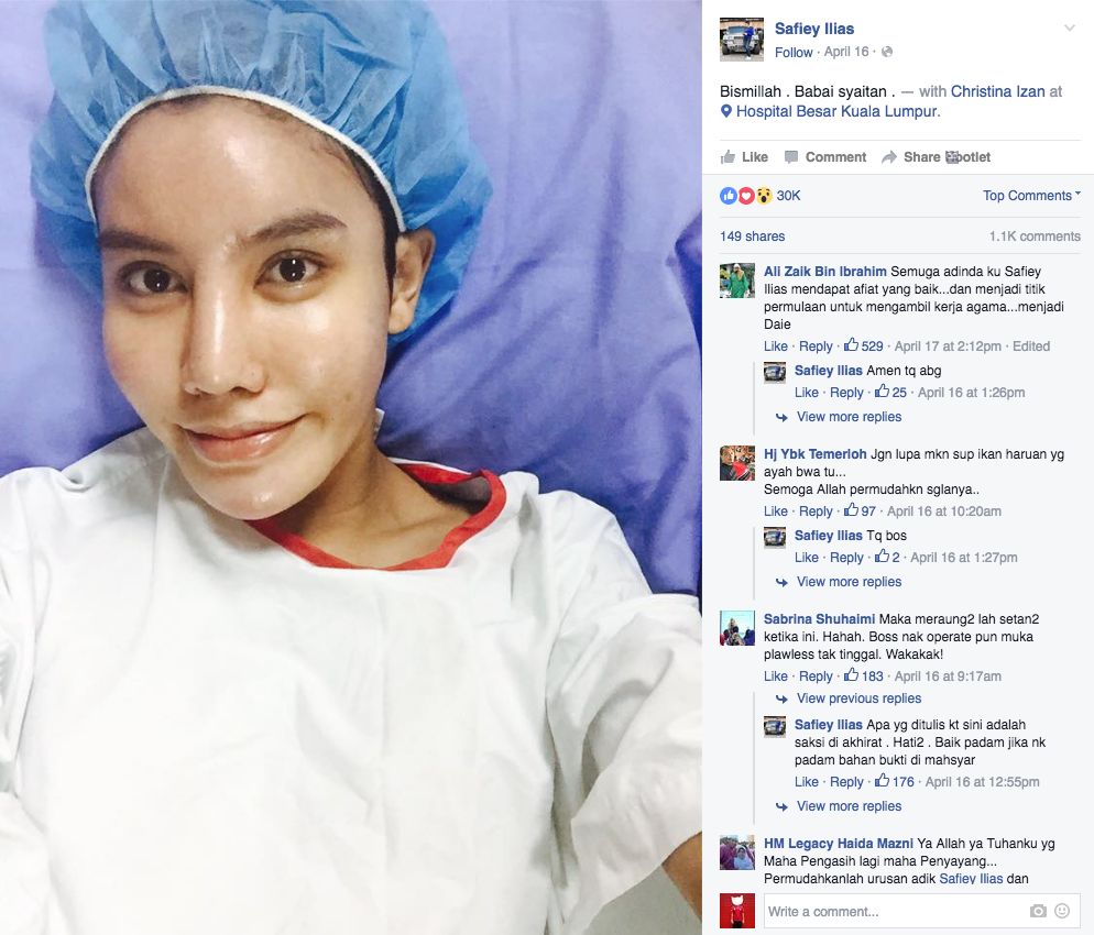 Sesungguhnya Safiey Ilias adalah seorang yang berjiwa besar. Jika tidak, mana mungkin beliau mampu menjana pendapatan 1 juta pertamanya pada umurnya 19 tahun. Beliau seorang yang bersungguh. Jika tidak, mana mungkin beliau mampu membina sebuah empayar perniagaan dalam usia yang muda. Beliau seorang yang bijak. Jika tidak, mana mungkin beliau ketemu hidayah dalam dunia gelap seorang Mak Nyah. Sesungguhnya hidayah itu milik Allah. Pada 16 April 2016, Safiey Ilias telah balik ke pangkal jalan dengan melakukan pembedahan untuk membuang implan pada bahagian dadanya.