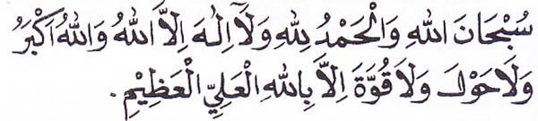 Ertinya: “Maha suci Allah dan segala pujian bagi Allah, tiada Tuhan melainkan Allah, Allah Maha Besar. Tiada suatu daya dan kekuatan melainkan dengan Allah yang Maha Tinggi lagi Maha Agung.“