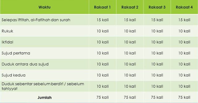 Setiap satu rakaat perlu dibaca 75 kali tasbih. Maka, 4 rakaat itu menjadikannya 300 tasbih.