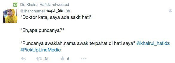 Selepas pelbagai versi pickup line sebelum ini, kali ini kita lihat pickupline versi doktor cinta pula. Jangan lupa cuba kat pasangan anda. Mana tau yang ni lagi berkesan. Chia chia chia. Hehe..
