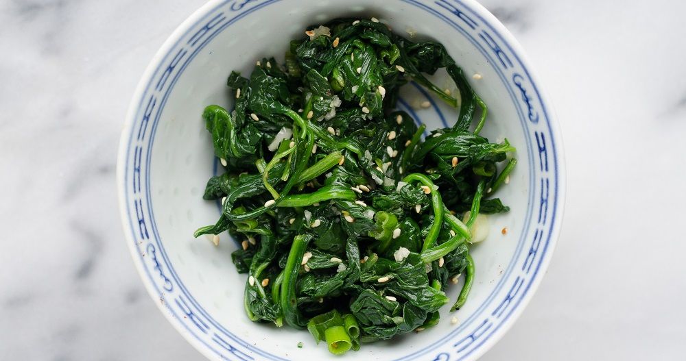- Di dalam mangkuk lain yang bersih, gaulkan sayur bayam ini dengan sedikit minyak bijan dan ketepikan.