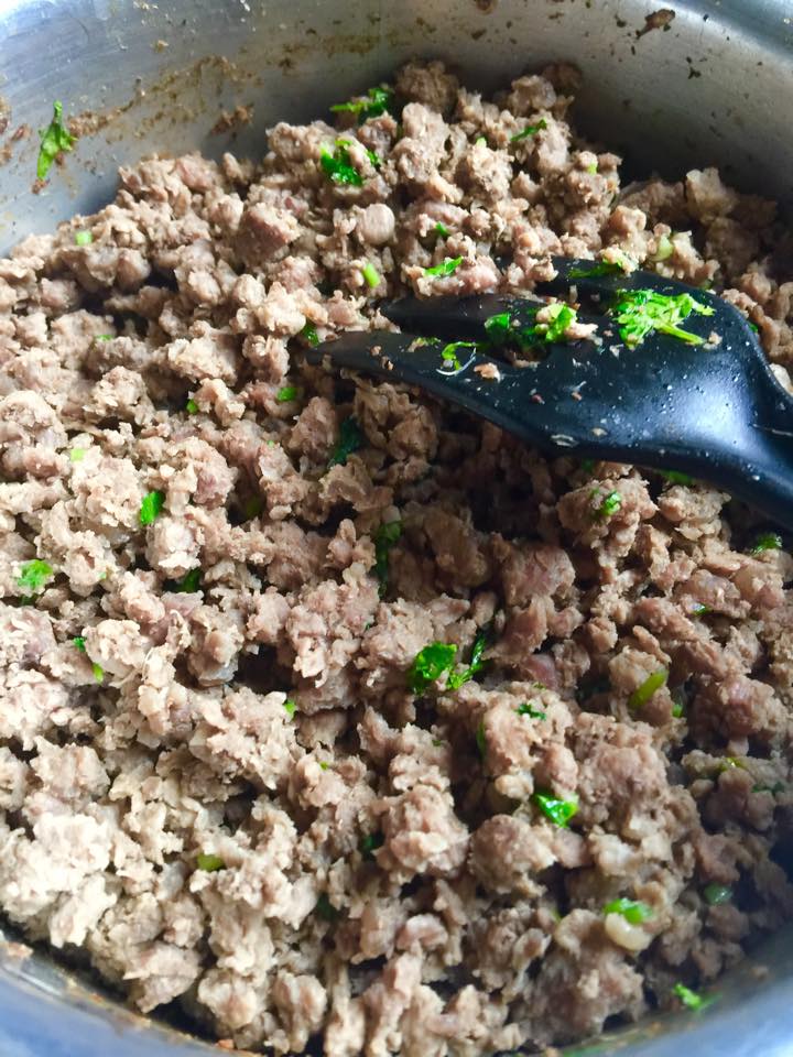 Kisar kesemua bahan iaitu bawang besar, bawang putih dan halia. Daging pula digoreng tanpa minyak, masukkan bahan kisar, serbuk ketumbar & serbuk jintan. Bila daging sudah empuk, masukkan garam, daun ketumbar dan hirisan lada.