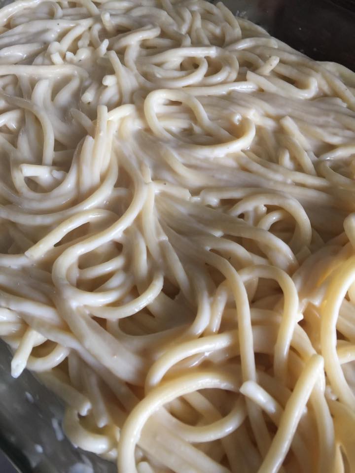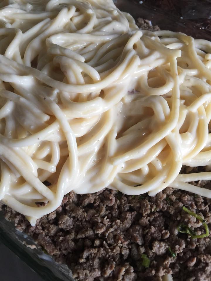 - Ambil separuh spaghetti yang sudah bergaul ini, masukkan ke dalam mangkuk Pyrex.